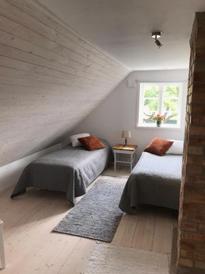 På ovanvåningen finns 2 sovrum med 2 enkelsängar i varje som naturligtvis går att flytta ihop till en dubbelsäng om så önskas.