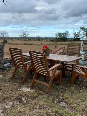 På tomten hittar du flera mysiga uteplatser med utsikt över Ölands alvar. Det finns även kolgrill och studsmatta på tomten.