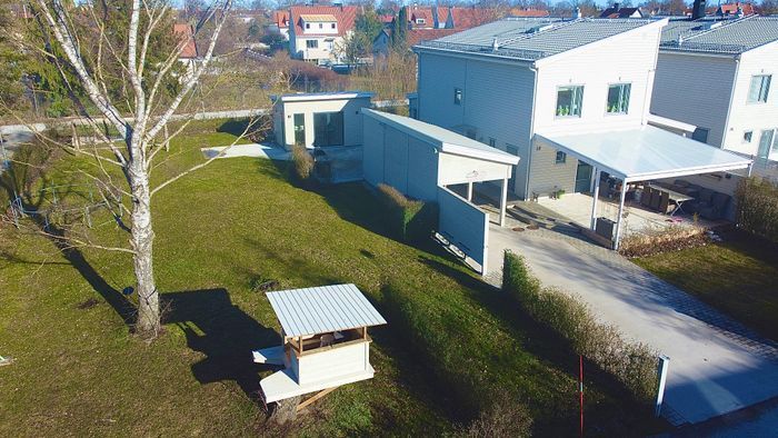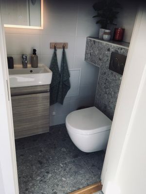 - Nybyggt annex med matgrupp och toalett med handfat.