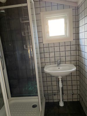 Helkalkat badrum med duschkabin.