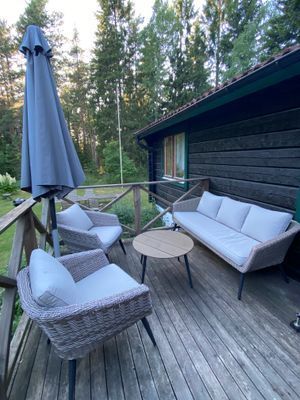 Vid entrén till huset finns en altan i söderläge. På altanen finns en loungegrupp bestående av en soffa, två fåtöljer och ett lågt bord.