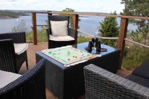 Stor altan mot sjösidan med utemöbler, solstolar och grill. Soligt sydvästläge. Ytterligare ett trädäck på andra sidan huset med morgonsol.