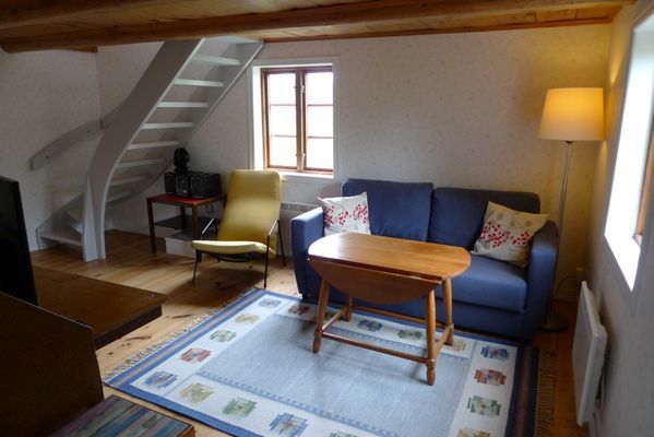 Övre hall: Tvåsitssoffa och ett skrivbord med skärm där du kan koppla in din dator. Här kan även 90-sängen från sovrummet ställas för att få två separata sovrum.