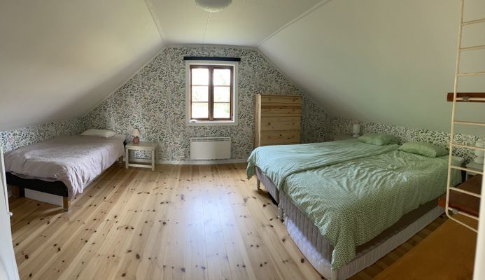 Sovrum: Dubbelsäng 180 cm och en enkelsäng 90 cm samt spjälsäng med eller utan hög sida. Skötbädd finns. Extra skumgummimadrass finns.
