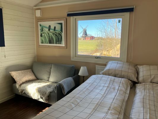 Mysig stuga på en charmig bondgård med höns, får, kor och hästar i Haverdal med fin utsikt mot Särdals kvarn från möblerad terass.