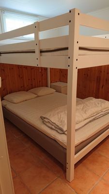 Stugan har två våningsplan. Från entrén/hallen möts ni av ett fullt utrustat kök innehållandes ugn, mikrovågsugn, kyl/frys, induktionshäll, diskmaskin, kaffebryggare et c. Köket erbjuder dessutom stora arbetsytor samt "alla" attiraljer man kan tänkas behöva för att slänga ihop vilken middag som helst. I anslutning till köket finns allrummet med bord och stolar för 6 personer samt bäddsoffa (för 2 personer) och tv. Intill bäddsoffan finns en altandörr om man hellre vill avnjuta middagen på altanen eller för att fånga dagens sista solstrålar i form av härlig kvällssol. I nedre delen av huset en trappa ner från allrummet finner ni ett sovrum innehållande sängplatser för 4 personer (1st loftsäng, 140cm och 1st "golvsäng", 140cm) och stor garderob med skjutdörrar samt en mindre garderob. Vidare ut i hallen kommer sedan en mindre tvättstuga med tvättmaskin och tvättho. Längst bort badrum med toalett samt dusch.