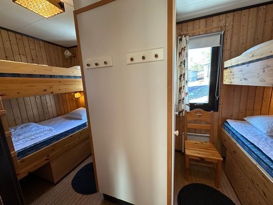 1-2 Sovrum: Rummet är avdelat med hög garderobsvägg så det blir 2 sovdelar, (2 våningssängar)
