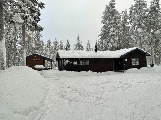 Timrad stuga med två extra fristående stugor samt separat byggnad med dusch, toalett och bastu.