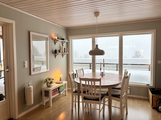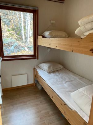 Stora sovrummet har en dubbelsäng (160cm). Mellanrummet har en våningsäng 140cm + 80cm. Lilla rummet har våningsäng 80cm + 70cm (190cm långa). Storstugan har kamin/öppen spis och matbord med finfin utsikt. Fullutrustat kök med gott om porslin och köksgeråd samt diskmaskin.