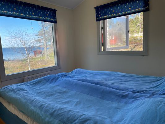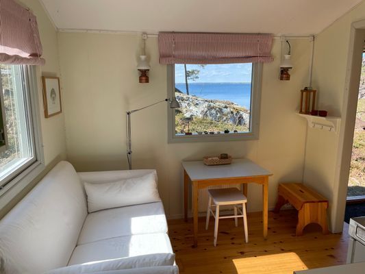 En mindre stuga innehåller ett litet allrum samt två sovrum med dubbelsängar. Mulltoa.