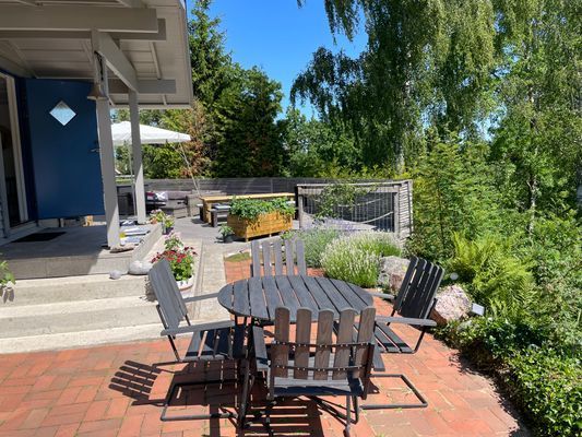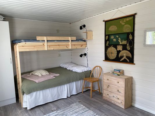 Notera att tomten är kuperad och det krävs att man kan gå i trappor. Tomten är terrasserad och det finns inga skyddsräcken förutom vid trädäcket. Husen och tomten är alltså EJ barnanpassade för små barn. Det är en del av charmen med tomten men boendet är olämplig för personer med nedsatt rörlighet eller för familjer med små barn, 1-4 år.