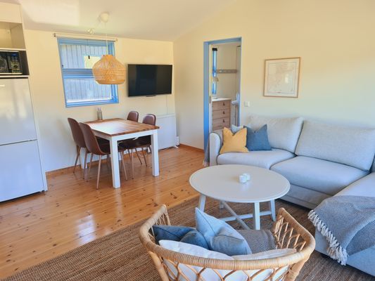 Den här stugan har 1 sovrum (m dubbelsäng 2 st 90x200), ett ljust allrum (m bäddsoffa 140 cm) och matplats och litet kök.