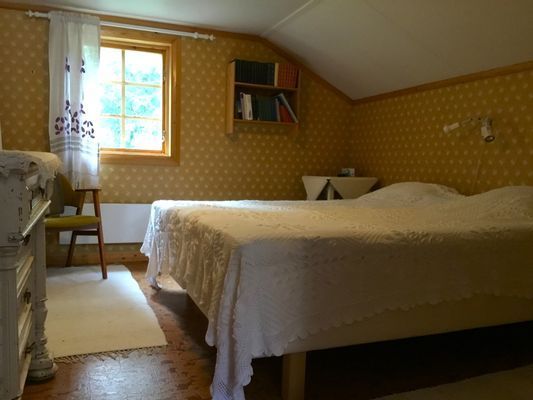 Ett sovrum på övervåning med dubbelsäng + 1 bädd i väggfast säng.
