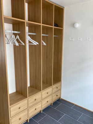 Gott om förvaring i hallen, med både krokar, lådor och hyllor samt en praktisk sittbänk. Skidförvaring i skåp med hänglås utanför entrén.