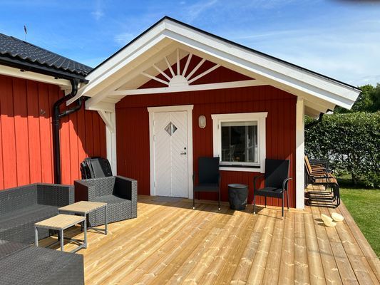 Härligt trä däck med solstolar i skyddat lägen med sol hela dagen.