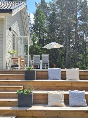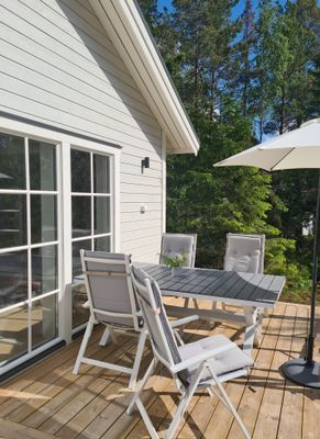 Värme/kyla styrs med luft-luftvärmepump så det finns AC om det behövs. 55 tums TV. Obegränsat mobilt wifi. Tillgång till olika utemöbler och grill. Större gräsmatta för lek.