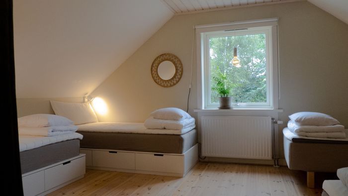 Övervåningen: Ett större sovrum med fyra enkelsängar, med möjlighet att göra en dubbelsäng av två av dem. TV-rum med soffa och två fåtöljer, två garderober och ett skrivbord. 55-tums vägg-TV, årsmodell 2023, som det går att koppla egen mobiltelefon till.