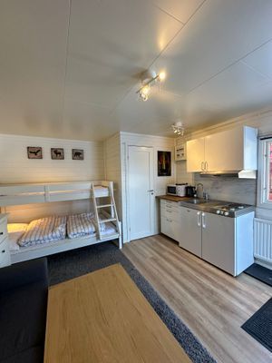 Stugorna som ligger endast några meter ifrån varandra har plats för upp till 4 personer vardera fördelat på en våningssäng och en bäddsoffa.