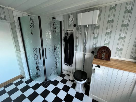 Dusch, toalett samt tvättmaskin.