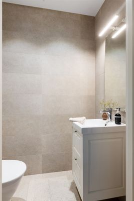 Takdusch, toalett, handfat och handdukstork/värmare.