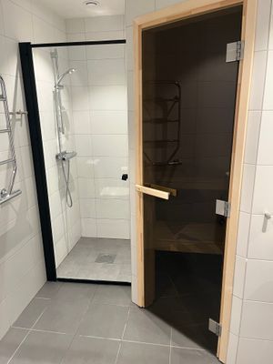 Stort helkaklat badrum med dusch och anslutande bastu där man med fördel kopplar av efter en dag med skidåkning. En extra helkaklad wc. Skidförråd i markplan.