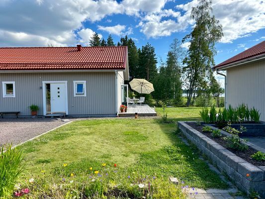 Gäststugan, byggd 2023, ligger i anslutning till vårt garage och är fristående från huvudbyggnaden på tomten. Den ligger längst ner på en liten väg ca 100 meter från Orsasjön med utsikt över sjön och den vackra omgivningen och har en altan i väst- och söderläge med sol från morgon till sen eftermiddag.