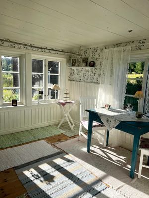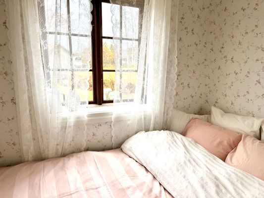 I den vita stugan som är nyrenoverad 2017 finns det ett litet sovrum med en 180 cm säng för 2.