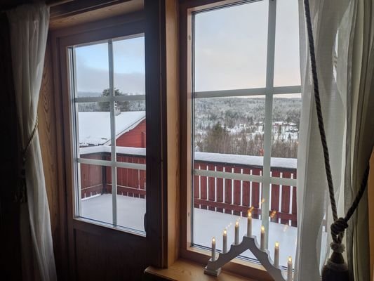 Vacker täljstenskamin att mysa framför med utsikt över backarna i Lindvallen från vardagsrumsfönstret.