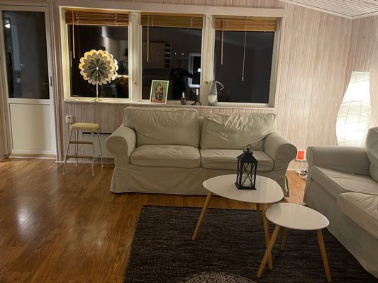 Storstugan, 45 m2, har sovrum med familjesäng och att stort allrum med bäddsoffa och plats för flera.