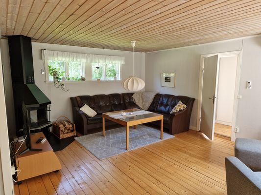 Stort vardagsrum med matplats, flera sittgrupper, TV och braskamin.