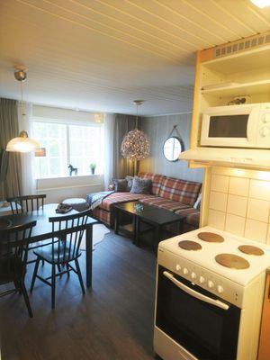 Köksdel: diskmaskin, kyl/frys, spishäll, ugn, mikrovågsugn, vattenkokare, kaffebryggare, våffeljärn, samt matplats för 4-6 personer.