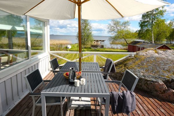 En stor terrass med panoramautsikt över sjön är den utmärkta platsen för middagar eller en stund i solen. Tomten består delvis av gräsmatta och en mindre skogsdunge så det finns gott om plats för uteaktiviteter. Det går att bada nere vid stenpiren, badskor rekommenderas. Närmsta större badstrand finns vid Hampetorps Camping ca 10 minuter bort.