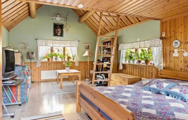 Sovrum C (i gäststugan) med dubbelsäng + loft med två bekväma golvmadrasser