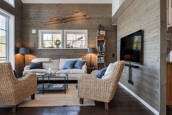 Sittgrupp med soffa och fåtöljer, stor TV med kanaler i fria marknätet, streamingtjänster och snabbt wifi via fiber.