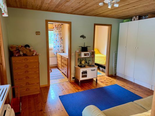 Stor stuga med alla bekvämligheter och fullt utrustat kök. Vardagsrum och allrum med bra lekmöjligheter för barn. Solig veranda och 75 m till egen strand med brygga. Barnvänlig sandstrand ca 400 m bort.