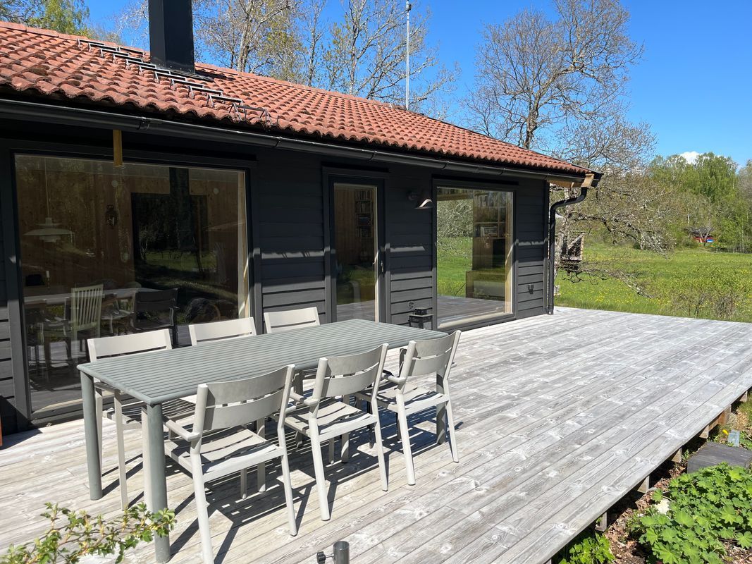 Stugan ligger i kanten av en större äng och är insynsskyddad från grannar.